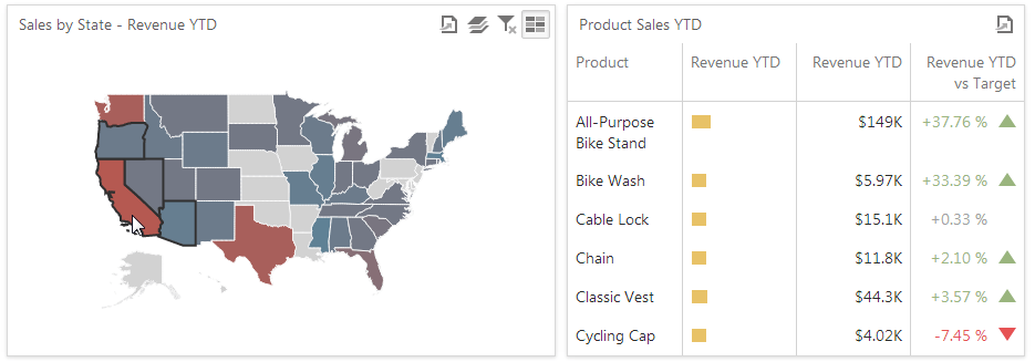 When Master Filtering is enabled, you can click a shape (or multiple shapes) to make other dashboard items only display data related to the selected shape (or shapes).
