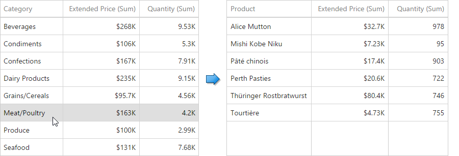 The Grid dashboard item supports drill-down for rows.When drill-down is enabled, you can click a grid row to view the details.
