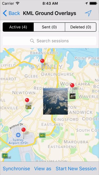 A KML or KMZ file can be added to a project to add custom geographic features to the maps that are displayed in the session list map view and any map points that are displayed in the session. KML can be used to pinpoint locations, add image overlays, and expose rich data in new ways. These geographic features can be displayed without an internet connection to create offline-capable maps. A KMZ archive is used to bundle the KML file with any supporting files that are used in the KML, such as images.